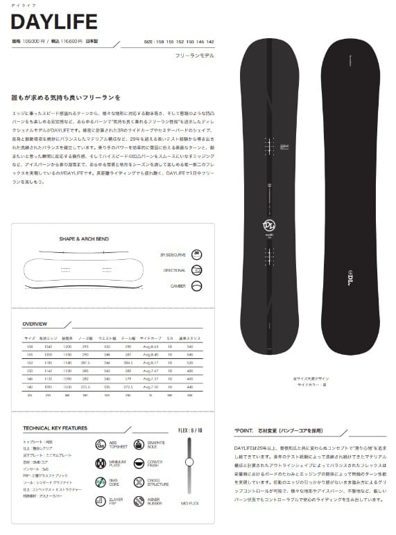 乗り手のパワーを効率的に雪面に伝える素直なターンと、動きたいと思った瞬間に反応する操作感、そしてハイスピードの凹凸バーンをスムースにいなすエッジングなど、アイスバーンから春の湿雪まで、あらゆる雪質と地形をシーズンを通して楽しめる唯一無二のフレックスを実現しているのがDAYLIFEです。