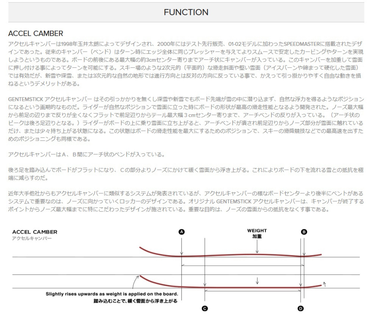 複合サイドカットをフルに使うことで、大きなバーンでのハイスピード・クルージングや荒れたバーンも安心して踏み込んでいける上に、フィッシュ・テールを活かせば3次元地形パークでの深いボトムターンも可能とする次世代のオールラウンド・ボードだ。