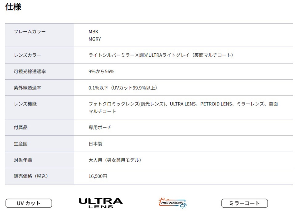 レンズ機能 フォトクロミックレンズ(調光レンズ)、ULTRA LENS、PETROID LENS、ミラーレンズ、裏面マルチコート