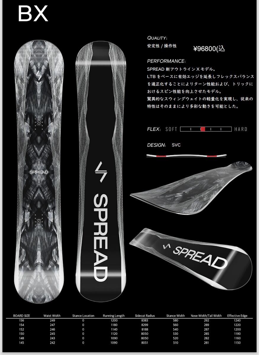 LTB をベースに有効エッジを延長しフレックスバランスを適正化することによりターン性能および、トリックにおけるスピン性能を向上させたモデル。